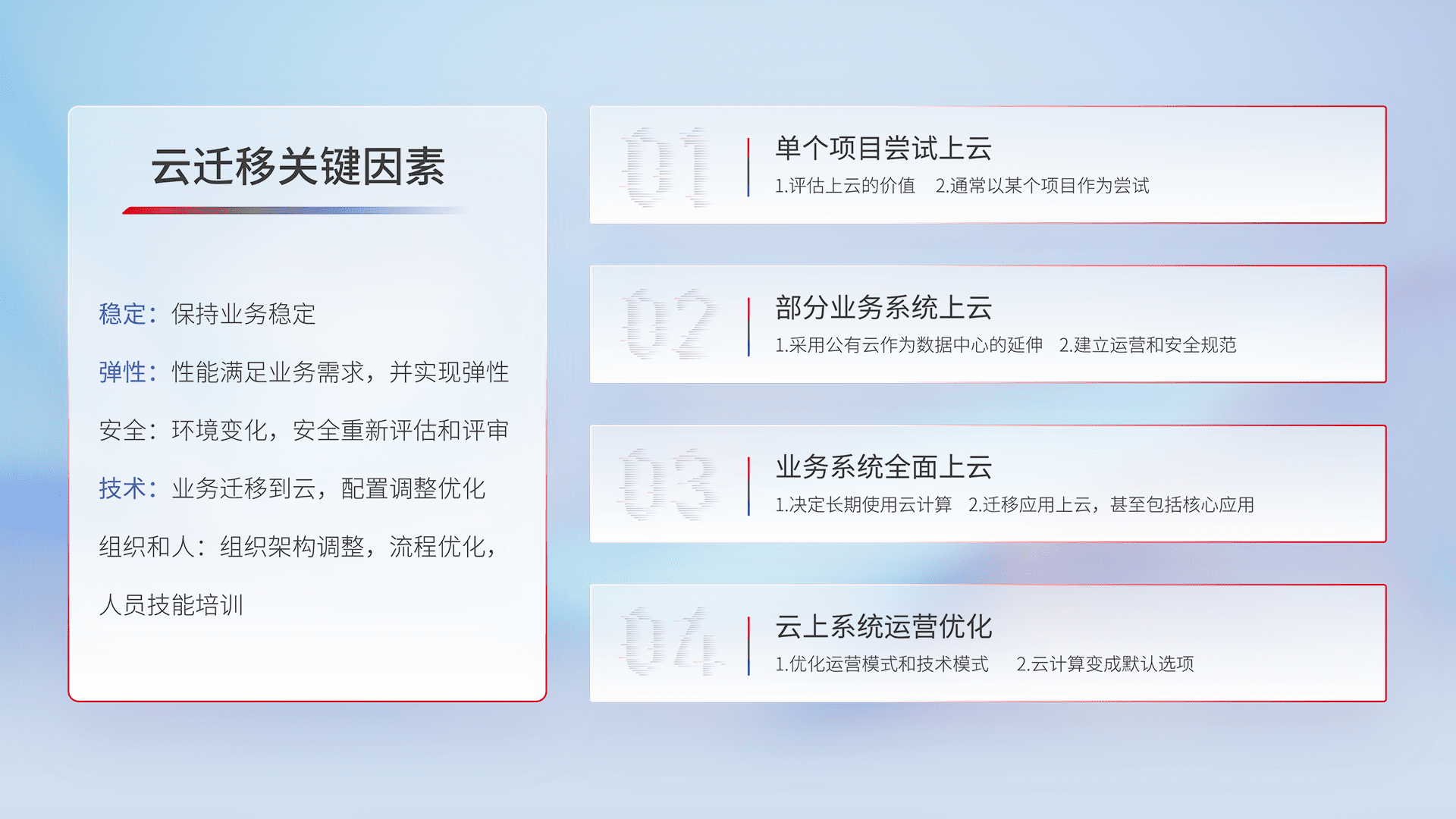 结合实际业务,,从规划设计、、云平台选型、、、云原生改造、、、数据迁移、、集成交付,,,,迁移全过程为客户识别最佳上云路径,,,,做好风险识别管理,,设计网络架构、、、、身份权限、、、安全审计合规、、、、操作审计、、、日志审计、、监控告警策略、、、多站点容灾设计等,,,对云上基础设施进行整体规划,,提升IT治理水平,,,以满足弹性、、、、高可用、、、、高性能的需求。。。。