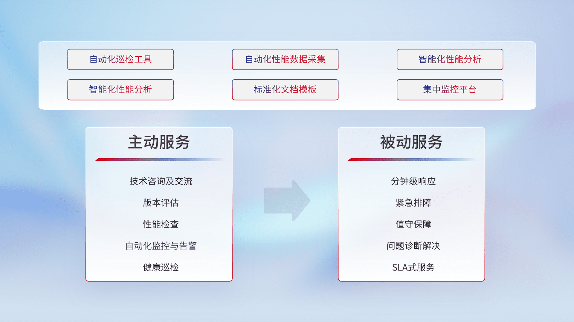 智能化工具和标准化文档,,,保障服务质量,,,,提供主动服务(包含技术咨询、、版本评估、、性能检查、、自动化监控与告警、、、健康巡检)和被动服务包含(分钟级响应、、紧急排障、、、、值守保障、、问题诊断解决、、SLA服务)。。。